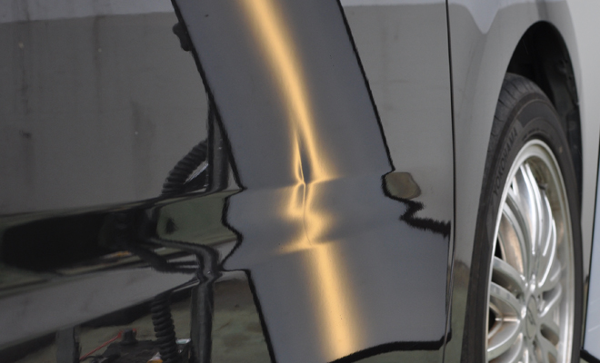 へこみがかなり深く尚且つ塗装面も面で傷がありましたがここまで形にすることが出来ました。